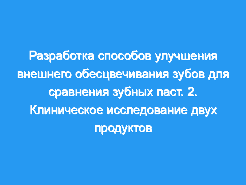 Внешнее окрашивание зубов считается неприглядным, и для предотвращения или устранения такого изменения цвета зубов был разработан ряд «отбеливающих» зубных паст. Целью этого исследования было сравнить эффективность предотвращения образования пятен двух зубных паст. Метод: Исследование представляло собой однослепое, рандомизированное, плацебо-контролируемое перекрестное исследование, сбалансированное по остаточным эффектам, с участием 24 здоровых добровольцев с зубчатыми зубами. Процедуры были следующими: (1) отбеливающая зубная паста, (2) экспериментальный состав зубной пасты и (3) вода. В течение каждого 4-дневного периода полоскания у испытуемых не оставалось пятен на зубах и языке. Примерно в час с 09:00 до 16:00 испытуемым полоскали рот хлоргексидиновым ополаскивателем в течение 1 минуты, а затем в течение 1 минуты пили теплый черный чай. Лечебные мероприятия проводились в 09:00 и 16:00 часов и перед полосканием хлоргексидином. Зубные пасты промывали в виде водной суспензии 3 г/10 мл и воды в виде полоскания по 10 мл каждая в течение 2 мин. На 5-й день испытуемым оценивали интенсивность и площадь окрашивания зубов и языка, и вычисляли их произведение. Период вымывания составлял не менее 9 дней.