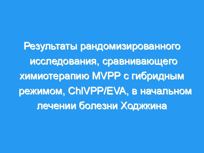 Цель и методы: В период с декабря 1984 по август 1992 года 423 пациента с впервые диагностированной болезнью Ходжкина (БГ) были включены в рандомизированное клиническое исследование, в котором сравнивался режим мехлоретамина, винбластина, прокарбазина и преднизолона (MVPP) с гибридным режимом, содержащим доксорубицин (хлорамбуцил, винбластин, прокарбазин и преднизон/этопозид, винкристин и доксорубицин [ChlVPP/EVA]). Средний возраст в группе составил 29,5 лет (диапазон от 15,2 до 68,8 лет), и у 52% были серьезные заболевания.