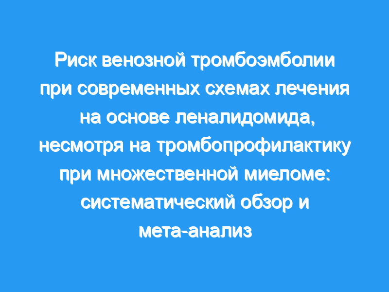 В результате поиска было получено 1372 ссылки, в том числе 51 клиническое исследование и 9069 пациентов, включенных для анализа. Наиболее распространенными средствами тромбопрофилактики были аспирин, низкомолекулярный гепарин или варфарин, назначаемые либо в соответствии со стратификацией риска, либо по усмотрению исследователей. Объединенная частота ВТЭ в исследованиях у пациентов с недавно диагностированной и рецидивирующей/рефрактерной миеломой составила 6,2% (95% ДИ, 5,4%-7,1%) при средней продолжительности лечения от 2 до 34 циклов, что привело к 1,2 событиям ВТЭ на 100 циклов пациентов (95% ДИ, 0,9-1,7 случая ВТЭ на 100 циклов пациента). Среди современных схем лечения риск ВТЭ был низким при комбинированном приеме леналидомида и дексаметазона в низких дозах (0,2 [95% ДИ, 0,1-0,6] события на 100 циклов пациента) и поддерживающем приеме леналидомида (0,0 [95% ДИ, 0,0-0,7] события на 100 циклов пациента). Риск ВТЭ был выше при комбинированном приеме леналидомида и низких доз дексаметазона плюс ингибиторы протеасом (1,3 [95% ДИ 0,7-2,3] случая на 100 циклов пациента).