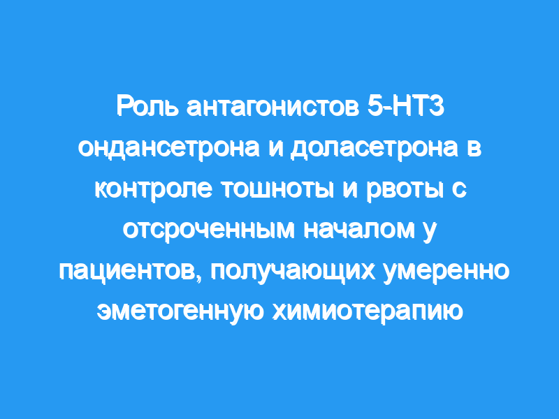 Антагонисты 5-НТ3 эффективны в уменьшении острой тошноты и рвоты, вызванных химиотерапией рака. Однако неясно, полезно ли продолжать прием этих препаратов более двадцати четырех часов для контроля рвоты на 2-7-й день после химиотерапии. Пациенты и методы: Четыреста семь пациентов, получавших умеренно эметогенную химиотерапию, которым вводили дексаметазон в дозе 8 мг внутривенно и либо ондансетрон в дозе 32 мг внутривенно, либо доласетрон в дозе 2,4 мг/кг внутривенно, были рандомизированы для продолжения приема пероральной формы антагониста 5-HT3 (ондансетрон в дозе 8 мг внутривенно или доласетрон 200 мг в день) плюс дексаметазон 8 мг перорально в день или только дексаметазон в течение двух-семи дней. Конечными точками, оцененными с помощью самоотчета, были: 1) полный контроль (отсутствие рвоты, отсутствие спасательных препаратов, отсутствие недостающих данных) рвоты, 2) тяжесть тошноты и 3) качество жизни, измеренное с помощью EORTC QLQ-C30.