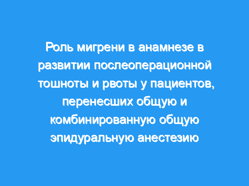 Цель исследования: Оценить роль мигрени в анамнезе в развитии послеоперационной тошноты и рвоты (PONV) у пациентов, перенесших общую и комбинированную общую эпидуральную анестезию.