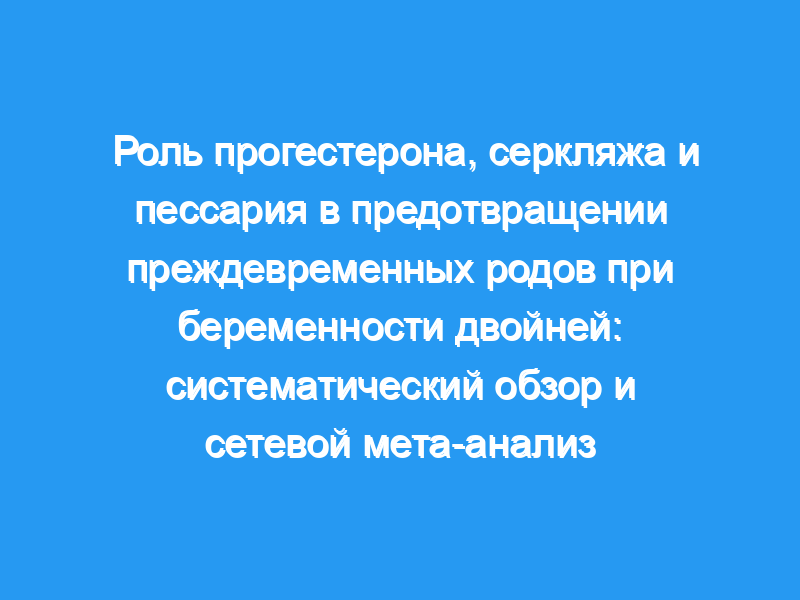 Определить роль прогестерона, пессария и цервикального серкляжа в снижении риска (преждевременных родов) ПТБ при двойных беременностях и сравнить эти вмешательства с помощью попарного и сетевого мета-анализа. Дизайн исследования: были изучены базы данных Medline, Embase, CINAHL и Cochrane. Критериями включения были исследования, в которых две беременности были рандомизированы для вмешательства для профилактики PTB (любой тип прогестерона, цервикальный серкляж, цервикальный пессарий или любая их комбинация) или в контрольную группу (например, плацебо или лечение в обычном режиме). Вмешательства, представляющие интерес, включали либо прогестерон [вагинальный или пероральный натуральный прогестерон или внутримышечное введение 17a-гидроксипрогестерона капроата (17-OHPC)], серкляж (Макдональд или Широдкар), либо цервикальный пессарий. Первичным исходом был PTB <, 34 недели беременности. Как первичные, так и вторичные исходы были изучены в невыбранной популяции двойных беременностей и у женщин с более высоким риском ПТБ (определяемых как женщины с длиной шейки матки <25 мм). Для анализа данных и результатов, выраженных в виде коэффициентов риска, были использованы мета-анализы с рандомизированным эффектом и множественным лечением.