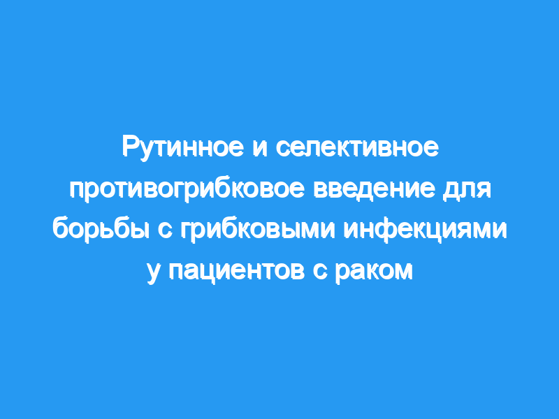 Были включены тридцать два исследования с участием 4287 пациентов. Профилактическое или эмпирическое лечение амфотерицином В значительно снизило общую смертность (относительный риск (ОР) 0,69, 95% доверительный интервал (ДИ) от 0,50 до 0,96), тогда как расчетный ОР для флуконазола, кетоконазола, миконазола и итраконазола был близок к 1,00. Не было обнаружено подходящих исследований с вориконазолом. Амфотерицин В и флуконазол снижали смертность, связанную с грибковой инфекцией (ОР 0,45, 95% ДИ 0,26-0,76 и ОР 0,42, 95% ДИ 0,24-0,73 соответственно). Частота инвазивных грибковых инфекций значительно снижалась при применении амфотерицина В (ОР 0,41, 95% ДИ 0,24-0,73), флуконазола (ОР 0,39, 95% ДИ 0,27-0,57) и итраконазола (ОР 0,53, 95% ДИ 0,29-0,97), но не кетоконазола или миконазола. Оценки эффекта были аналогичны для тех 13 испытаний, которые имели адекватное сокрытие распределения и были слепыми. Сообщения о вреде были слишком разными от судебного разбирательства к судебному разбирательству, чтобы можно было провести содержательный обзор. Для обновлений 2011 и 2014 годов не было определено никаких дополнительных испытаний для включения. Выводы авторов: Внутривенное введение амфотерицина В было единственным противогрибковым средством, которое снижало общую смертность. Поэтому следует отдавать предпочтение профилактической или эмпирической противогрибковой терапии у онкологических больных с нейтропенией.