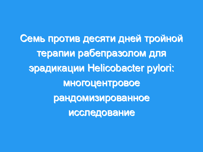 Сравнить эффективность 7- и 10-дневной тройной терапии на основе рабепразола для эрадикации H. pylori. Пациенты и методы: Четыреста пятьдесят восемь пациентов были рандомизированы на 7 или 10 дней тройной терапии, включающей рабепразол 20 мг, кларитромицин 500 мг и амоксициллин 1 г, все два раза в день. Скорость излечения оценивали с помощью дыхательного теста с мочевиной.