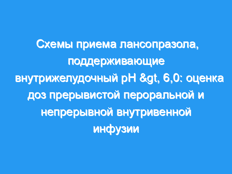 В двух аналогичных трехходовых рандомизированных перекрестных исследованиях, в каждом из которых участвовало 36 здоровых людей с отрицательной реакцией на Helicobacter pylori. добровольцы. Схемы исследования 1 включали внутривенное болюсное введение с последующей 24-часовой непрерывной инфузией (лансопразол 90 мг, 6 мг/ч, лансопразол 120 мг, 6 мг/ч, пантопразол 80 мг, 8 мг/ч). Схемы исследования 2 включали внутривенное болюсное введение с последующей пероральной таблеткой лансопразола или внутривенную непрерывную инфузию в течение 24 ч (лансопразол 90 мг, лансопразол пероральная таблетка 60 мг каждые 6 ч, лансопразол 120 мг, 9 мг/ч, пантопразол 80 мг, 8 мг/ч). Процент времени pH >,6,0, оценивали с помощью 24-часового внутрижелудочного мониторинга pH.