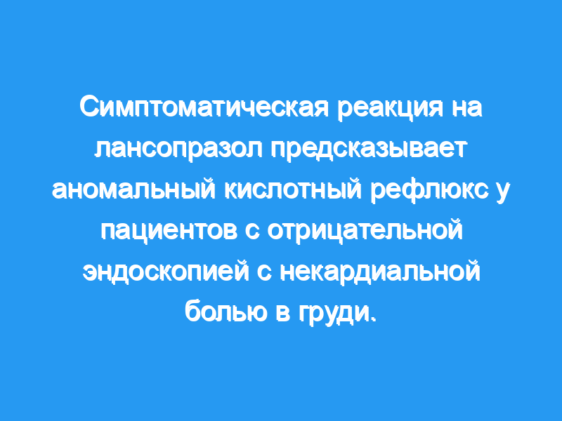 В целом исследование завершили 68 пациентов, 36 из которых принимали лансопразол и 32 — плацебо. Оценка симптомов была значительно снижена в обеих группах (P <, 0,001). В группе лансопразола у большего числа пациентов с аномальным рефлюксом, чем без него, наблюдалось улучшение симптомов (92% против 33%, отношение шансов = 22, 95% доверительный интервал 2,3-201,8, chi2 = 10,9, P = 0,001), что дает чувствительность, специфичность, положительную прогностическую ценность, отрицательную прогностическую ценность и точность. из 92%, 67%, 58%, 94% и 75% соответственно. В группе плацебо показатели улучшения симптомов были одинаковыми у пациентов с аномальным рефлюксом и без него (33% против 35%, P = N.S.).