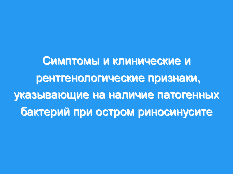 Патогенные бактерии были обнаружены у 77 пациентов (29%). Клинические признаки и симптомы, достоверно связанные в многофакторной модели с присутствием бактерий, включали окрашенные выделения из носа (p <, 0,003), лицевую боль (p <, 0,032) и рентгенологически определяемый гайморит (полная непрозрачность, уровень воздушной жидкости или утолщение слизистой оболочки > 10 мм). (p <, 0,001). Эта наилучшая прогностическая модель имела чувствительность 69% и специфичность 64% и, следовательно, не могла быть использована ни в качестве инструмента скрининга, ни в качестве диагностического критерия бактериального риносинусита.