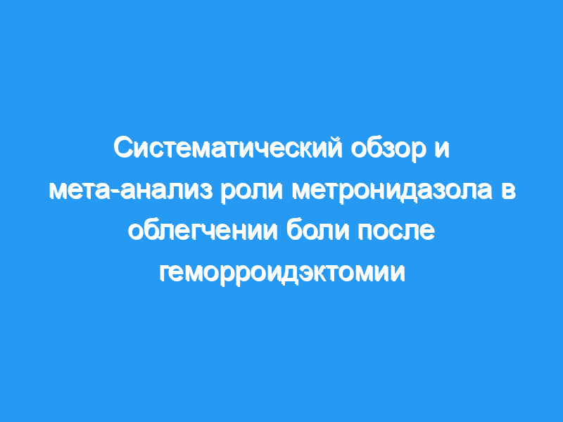 Традиционная геморроидэктомия по-прежнему считается эталонным стандартом лечения тяжелого или рецидивирующего геморроя. Пациенты сообщают, что боль является наиболее распространенным послеоперационным осложнением. Хотя в литературе нет единого мнения о его эффективности, метронидазол часто используется для уменьшения послеоперационной боли. Мы провели мета-анализ всех рандомизированных контролируемых исследований (РКИ), в которых изучалось применение метронидазола для облегчения боли после геморроидэктомии. Метод: Был проведен систематический обзор в соответствии с протоколом PRISMA с использованием заголовков сетки «геморроидэктомия», «гемороидэктомия», «геморроидэктомия», «геморрой», «метронидазол», «Флагил®», «антибиотик» и «боль». Поиск вернул 421 статью, из которых восемь были РКИ, подходящими для включения в обзор, с общей популяцией 437 пациентов. Исходами, представляющими интерес, были интенсивность послеоперационной боли на 1, 2 и 7-й дни и при первой дефекации, измеренная с помощью визуальной аналоговой шкалы.