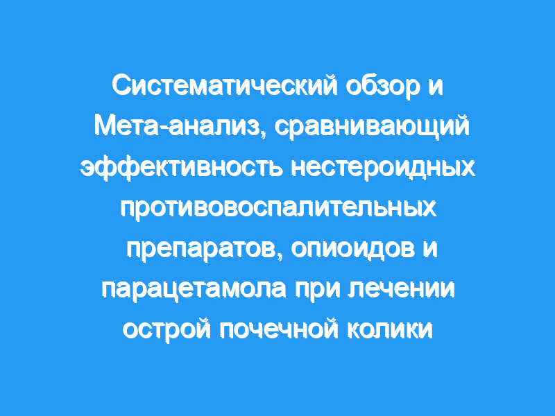 Целью данного систематического обзора и мета-анализа было сравнение безопасности и эффективности НПВП с опиоидами и парацетамолом (ацетаминофеном) для лечения острой почечной колики. Сбор доказательств: Cochrane Central Register of Controlled Trials, MEDLINE, EMBASE, Платформа регистрации международных клинических испытаний Всемирной организации здравоохранения, Google Scholar и список использованных статей были найдены до декабря 2016 года без языковых ограничений. Два рецензента независимо оценивали подходящие исследования, используя инструмент Cochrane Collaboration для оценки и отчетности о риске предвзятости и абстрагированных данных с использованием предопределенных полей данных. Обобщение фактических данных: Из 468 потенциально значимых исследований в этот систематический обзор были включены 36 рандомизированных контролируемых исследований (РКИ) с участием 4887 пациентов, опубликованных в период с 1982 по 2016 год. Наблюдаемый эффект лечения указывал на предельное преимущество НПВП перед опиоидами в первоначальном уменьшении боли через 30 минут (11 РКИ, n=1985, средняя разница [MD] -5,58, 95% доверительный интервал [ДИ] -10,22 -0,95, гетерогенность I2=81%). В анализах подгрупп по способу введения НПВП требовали меньшего количества спасательных процедур (семь РКИ, n=541, количество, необходимое для лечения [NNT] 11, 95% ДИ 6-75) и имели более низкую частоту рвоты по сравнению с опиоидами (пять РКИ, n=531, NNT 5, 95% ДИ 4-8). Сравнение НПВП с парацетамолом не показало различий для обоих препаратов через 30 минут (четыре РКИ, n=1325, MD -5,67, 95% ДИ -17,52 — 6,18, p=0,35, I2=89%). Пациенты, получавшие НПВП, нуждались в меньшем количестве спасательных процедур (два исследования, n=1145, отношение рисков 0,56, 95% ДИ 0,42-0,74, p< 0,001, I2=0%).