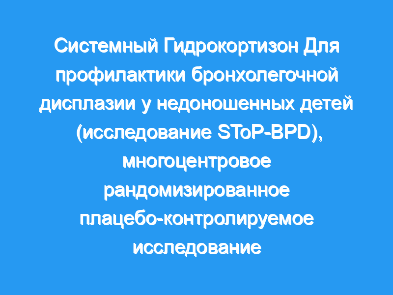 Рандомизированные контролируемые исследования показали, что лечение хронически вентилируемых недоношенных детей после первой недели жизни дексаметазоном снижает частоту комбинированного исхода — смерти или бронхолегочной дисплазии (БЛД). Однако существуют опасения, что дексаметазон может увеличить риск неблагоприятных последствий для развития нервной системы. Гидрокортизон был предложен в качестве альтернативной терапии. До сих пор ни в одном рандомизированном контролируемом исследовании не изучалась его эффективность при введении после первой недели жизни недоношенным детям с искусственной вентиляцией легких. Методы/дизайн: Исследование SToP-BPD представляет собой рандомизированное двойное слепое плацебо-контролируемое многоцентровое исследование, включающее 400 младенцев с очень низкой массой тела при рождении (гестационный возраст < 30 недель и/или масса тела при рождении < 1250 грамм), которые зависят от аппарата ИВЛ в послеродовом возрасте 7-14 дней. Гидрокортизон (кумулятивная доза 72,5 мг/кг) или плацебо вводят в течение 22-дневного графика снижения дозы. Первичным показателем исхода является комбинированный исход смертности или БЛД в возрасте 36 недель после менструации. Вторичными исходами являются кратковременные последствия для состояния легких, побочные эффекты во время госпитализации и отдаленные последствия для развития нервной системы, оцениваемые при сроке беременности с поправкой на 2 года. Анализ будет проводиться на основе намерения лечить.