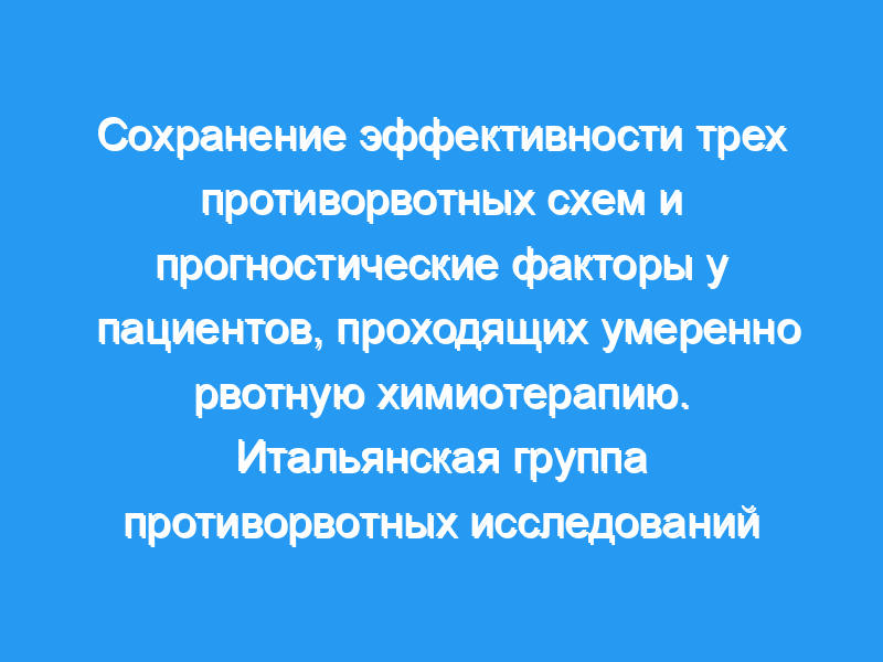 Оценить противорвотную эффективность и переносимость гранисетрона, дексаметазона и их комбинации при повторных курсах умеренно рвотной химиотерапии, а также влияние прогностических факторов на возникновение тошноты и рвоты. Пациенты и методы: Четыреста двадцать восемь последовательных онкологических больных были включены в многоцентровое рандомизированное двойное слепое исследование для сравнения гранисетрона 3 мг внутривенно, дексаметазона 8 мг внутривенно и 4 мг перорально каждые 6 часов в течение четырех доз или комбинации дексаметазона плюс гранисетрон в тех же дозах, вводимых в течение трех последовательных циклов. Возникновение тошноты, рвоты и рвоты отслеживалось в течение 24 часов после введения химиотерапии с помощью дневниковой карточки.