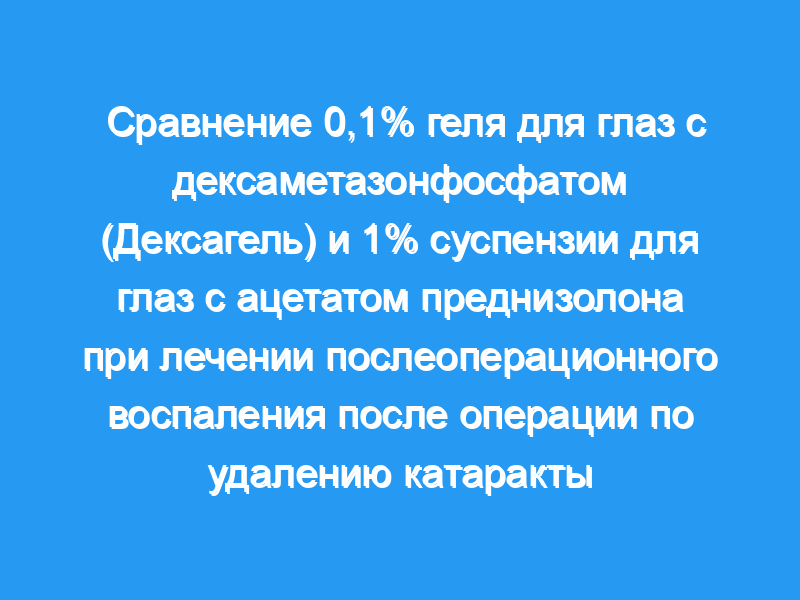 Было проведено проспективное многоцентровое клиническое параллельное групповое исследование для оценки эффективности и безопасности нового 0,1% геля для глаз с дексаметазона фосфатом (группа 1, n= 117) по сравнению с 1% суспензией ацетата преднизолона для глаз (группа 2I, n=119) в общей сложности 236 пациенты (безопасная популяция) в возрасте 39-92 лет после операции по удалению катаракты. Оба препарата вводили четыре раза в день в течение 14 дней, начиная с 24+/-4 ч после операции. Критериями оценки были уменьшение вспышки в передней камере и оценка тяжести воспаления (первичные критерии эффективности), а также различные вторичные критерии оценки эффективности и безопасности. Лазерная фотометрия (LFM-500, Kowa), оценка щелевой лампы и изучение других объективных и субъективных симптомов дискомфорта в глазах были выполнены между последним предоперационным и 14-м послеоперационным днем. Не было статистически значимых различий между группами лечения в отношении первичных и вторичных критериев эффективности. Среднее уменьшение вспышки в передней камере с 1-го по 14-й день после операции составило 8,34+/-20,80 фотон/мс с 0,1% глазным гелем дексаметазона и 5,72+/-16,70 фотон/мс с 1% глазной суспензией преднизолона. Среднее снижение оценки тяжести воспаления составило 1,8+/-1,3 балла в 1-й группе и 2,0+/-1,1 балла во 2-й группе. Внутриглазное давление не повышалось после лечения 0,1%-ным глазным гелем дексаметазона фосфата.