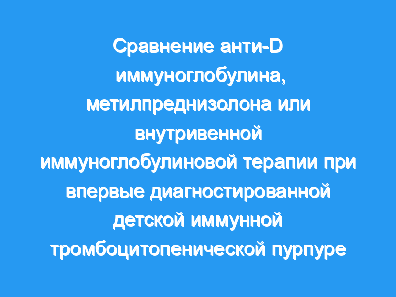 Целью данного исследования была оценка эффективности, стоимости и влияния терапии анти-D иммуноглобулином (анти-D Ig), метилпреднизолоном или внутривенным иммуноглобулином (внутривенно) на развитие хронических заболеваний у резус-положительных детей с диагностированной иммунной тромбоцитопенической пурпурой (ИТП). Дети с впервые диагностированным ИТП и количеством тромбоцитов <20 000/мм (3) были проспективно рандомизированы для лечения анти-D Ig (50 мкг/кг), метилпреднизолоном (2 мг/кг/сут) или внутривенным введением (0,4 г/кг/сут, 5 дней). Шестьдесят детей со средним возрастом 6,7 лет были разделены на три равные группы.
