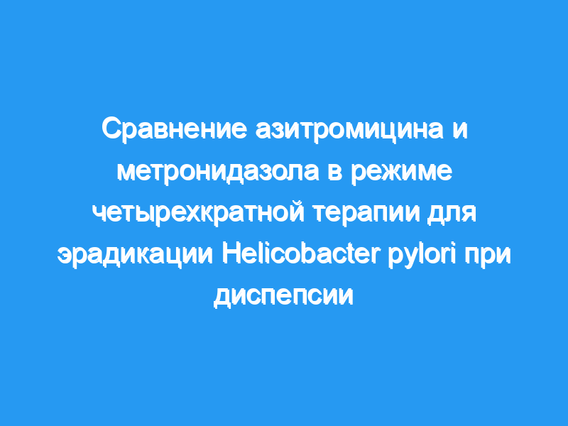 Справочная информация/цель: Helicobacter pylori (H. pylori) играет важную роль в патогенезе хронического гастрита, язвенной болезни и новообразований желудка. Поэтому необходимо выбрать эффективный режим эрадикации H. pylori. Целью этого исследования было сравнить эффективность двух схем четырехкратной терапии — одной с азитромицином, а другой с метронидазолом — для эрадикации H. pylori у пациентов с диспепсией.