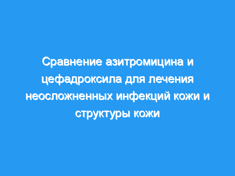 В этом многоцентровом слепом исследовании мы сравнили эффективность и безопасность азитромицина и цефадроксила для лечения неосложненных инфекций кожи и структуры кожи (SSSI). В общей сложности 296 пациентов были рандомизированы для получения либо азитромицина (500 мг в 1-й день, затем 250 мг один раз в день в 2-5-й дни), либо цефадроксила (500 мг два раза в день в течение 10 дней). В исследование были включены амбулаторные пациенты в возрасте от 18 до 75 лет с острым неосложненным SSSI.