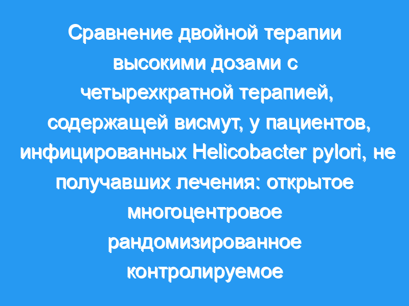 Четырехкратная терапия, содержащая висмут, для эрадикации Helicobacter pylori (H. pylori) имеет относительно высокую частоту побочных эффектов и высокую стоимость, поэтому рассматривается вариант двойной терапии высокими дозами с высокой скоростью эрадикации и меньшим количеством побочных эффектов. Тем не менее, исследования двойной терапии по-прежнему немногочисленны и в основном представляют собой одноцентровые исследования с ограниченной обобщаемостью. Необходимы крупномасштабные многоцентровые исследования. В нашем исследовании изучалась и сравнивалась эффективность, побочные эффекты, соблюдение пациентами требований и затраты на двойную терапию высокими дозами с таковыми при четырехкратной терапии, содержащей висмут, у пациентов, инфицированных H. pylori, не получавших лечения, в проспективном, многоцентровом, открытом рандомизированном контролируемом исследовании. Способ: Пациенты, не получавшие лечения, инфицированные H. pylori, были рандомизированы для получения двойной терапии в высоких дозах (эзомепразол 20 мг 4 раза в день и амоксициллин 1000 мг 3 раза в день в течение 14 дней) или четырехкратной терапии, содержащей висмут (эзомепразол 20 мг, амоксициллин 1000 мг, кларитромицин 500 мг и висмут цитрат калия 220 мг, все два раза в день в течение 14 дней). Сравнивались эффективность, побочные эффекты, соблюдение пациентами требований и затраты в обеих группах.