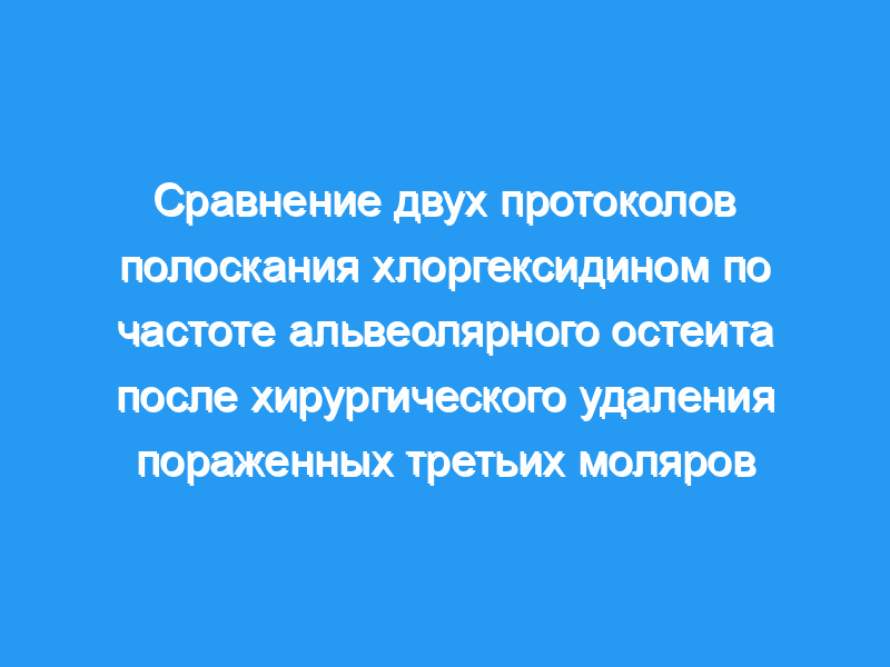 Принципы: Альвеолярный остеит (сухая лунка) является наиболее распространенным осложнением после удаления постоянных зубов. Это исследование было проведено для сравнения влияния двух протоколов полоскания хлоргексидином на частоту альвеолярного остеита у пациентов, перенесших хирургическое удаление пораженных третьих коренных зубов нижней челюсти.