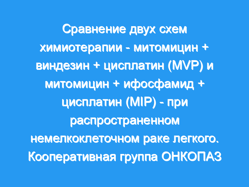 Было проведено проспективное рандомизированное исследование для сравнения эффективности и токсичности двух схем химиотерапии, широко используемых при распространенном немелкоклеточном раке легкого (НМРЛ). Пациенты и методы: С января 1989 по март 1992 года в исследование были включены 196 пациентов с поддающимся измерению заболеванием. Девяносто три пациента получали митомицин-виндезин-цисплатин (MVP) и 94 митомицин-ифосфамид-цисплатин (MIP).