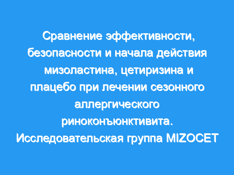 Целью этого европейского многоцентрового рандомизированного двойного слепого исследования было сравнение эффективности мизоластина в дозе 10 мг (n = 122), цетиризина в дозе 10 мг (n = 125) и плацебо (n = 128) один раз в день в течение 28 дней у пациентов с сезонным аллергический риноконъюнктивит (САР), с акцентом на начале действия.