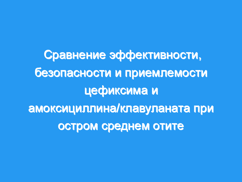 В многоцентровом рандомизированном клиническом исследовании сравнивали цефиксим (CFX, 8 мг/кг один раз в день) с амоксициллином/клавуланатом (В/В, 40 мг/кг/сут в трех разделенных дозах) для лечения детей с АОМ. Триста тринадцать детей были случайным образом распределены на 10-дневный курс либо CFX (n = 158), либо A/C (n = 155). На основании анамнеза, физикальных осмотров и отоскопических и тимпанометрических оценок клинические реакции оценивались как излечение, улучшение, неудача, рецидив или отсутствие эффекта. Также были проанализированы комплаентность и приемлемость для пациента/родителя.