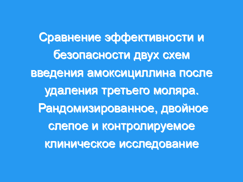 Целью этого сравнительного двойного слепого проспективного рандомизированного клинического исследования была оценка двух схем введения амоксициллина. Первым была короткая профилактическая терапия, а вторым — длительный послеоперационный режим. План исследования: Исследуемая популяция состояла из 160 пациентов, которым была проведена экстракция третьего моляра нижней челюсти. Пациенты были рандомизированы на две равные группы. В 1-й группе за 1 час до процедуры вводили 2 грамма амоксициллина и 1 грамм через 6 часов после операции. Во 2-й группе пациенты получали 1 грамм амоксициллина через 6 часов после операции, затем по 1 грамму каждые 8 часов в течение 4 дней. Все пациенты получали одинаковое количество таблеток благодаря использованию таблеток плацебо. Всего было оценено 25 переменных, таких как альвеолит, хирургическая инфекция, количество необходимых анальгетиков, субъективная шкала боли, послеоперационное воспаление, последовательность диеты, подмышечная температура и потеря миллиметров открывания рта после операции.