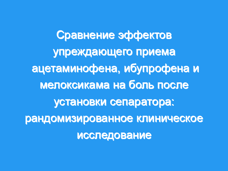 Целью данного исследования является оценка и сравнение эффекта предпроцедурного введения ацетаминофена, ибупрофена и мелоксикама в уменьшении боли после установки сепаратора. Триста двадцать один пациент в возрасте старше 15 лет, нуждавшийся в ортодонтическом лечении, был случайным образом распределен в одну из трех исследуемых групп: группа А: 650 мг ацетаминофена, группа В: 400 мг ибупрофена и группа С: 7,5 мг мелоксикама. Все испытуемые получили однократную дозу лекарства за 1 ч до установки сепаратора. Используя визуальную аналоговую шкалу, пациенты регистрировали свое восприятие боли во время отдыха, сближения задних зубов и жевания с интервалами времени сразу, через 2, 6, 24 и 48 ч после установки сепаратора.