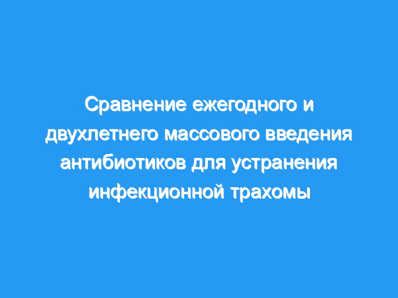 Определить, может ли двухлетнее лечение устранить глазную хламидийную инфекцию у детей дошкольного возраста, и сравнить результаты с ежегодным лечением, рекомендованным Всемирной организацией здравоохранения. Разработка, организация и участники: Кластерное рандомизированное клиническое исследование двухлетнего и ежегодного массового введения азитромицина всем жителям 16 сельских деревень в зоне Гураге, Эфиопия, с марта 2003 по апрель 2005 года. Вмешательства: При плановом лечении всем лицам в возрасте от 1 года и старше предлагалась однократная доза перорального азитромицина либо ежегодно, либо раз в два года. Основной показатель результата: распространенность глазной хламидийной инфекции в деревне и наличие элиминации через 24 месяца у детей дошкольного возраста, определяемая методом полимеразной цепной реакции с поправкой на исходную распространенность. Лечение антибиотиками проводилось после взятия образцов.