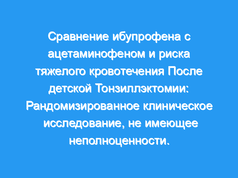 Из 741 ребенка, включенных в исследование, 688 детей (92,8%) (средний [межквартильный диапазон] возраст 5 [4] лет, 366 мальчиков [53,2%]) получали исследуемый препарат и были включены в модифицированный анализ намерения лечить. Частота кровотечений, требующих оперативного вмешательства, составила 1,2% в группе ацетаминофена и 2,9% в группе ибупрофена (разница 1,7%, верхний предел ДИ 97,5%, 3,8%, P = .12 для неполноценности). Не было никаких существенных побочных эффектов или смертельных исходов. Выводы и актуальность: Это исследование не могло исключить более высокую частоту тяжелых кровотечений у детей, получавших ибупрофен после одной тонзиллэктомии или тонзиллэктомии с аденоидэктомией. Это открытие следует учитывать при выборе режима послеоперационного обезболивания. Необходимы дальнейшие исследования, чтобы понять, влияет ли на риск кровотечения применение ибупрофена в течение более короткого периода времени или в комбинации с ацетаминофеном для послеоперационной анальгезии. Пробная регистрация: ClinicalTrials.gov идентификатор: NCT01605903.
