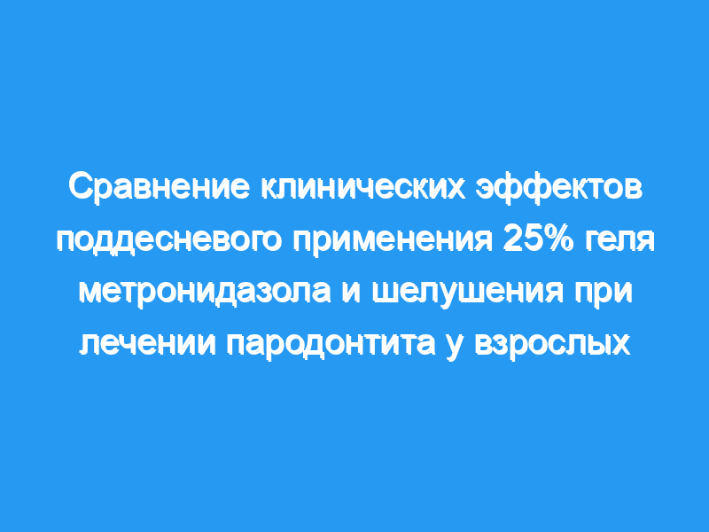 Контроль поддесневого налета имеет первостепенное значение при лечении заболеваний пародонта. Роль поддесневой антибактериальной терапии с замедленным высвобождением нуждается в разъяснении. Было проведено однослепое клиническое исследование у 13 пациентов с периодонтитом у взрослых, чтобы сравнить эффекты поддесневого применения зубного геля метронидазола с эффектами поддесневого шелушения. Способ и материалы: Была использована конструкция с разделенным ртом, чтобы каждый пациент получал все процедуры одновременно. Случайно выбранные квадранты обрабатывали нанесением 25% геля метронидазола, поддесневым шелушением или комбинацией шелушения и нанесения геля. Оставшийся квадрант у каждого пациента оставляли без лечения в качестве контроля.
