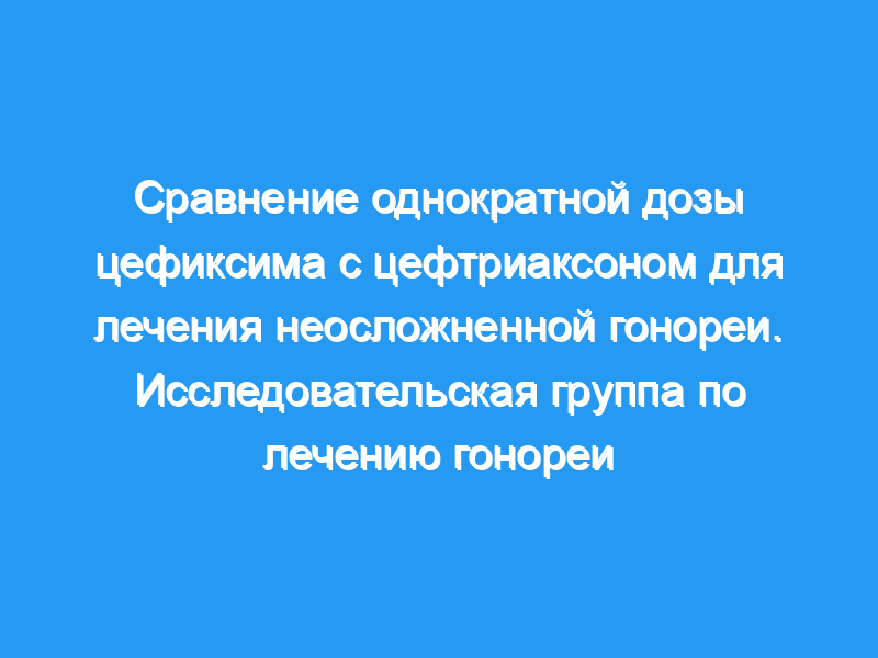 Из-за широкого распространения Neisseria gonorrhoeae, устойчивых к пенициллину или тетрациклину, цефтриаксон в настоящее время рекомендуется для лечения гонореи. Однако существует потребность в эффективных антибиотиках, которые можно вводить перорально в качестве альтернативы цефтриаксону, который требует внутримышечного введения. Цефиксим представляет собой абсорбируемый перорально цефалоспорин, который активен в отношении резистентных гонококков и обладает фармакокинетической активностью, подходящей для однократного введения. Методы и результаты: В рандомизированном, открытом многоцентровом исследовании с участием 209 мужчин и 124 женщин с неосложненной гонореей мы сравнили три схемы однократного лечения: 400 мг или 800 мг цефиксима, вводимого перорально, и 250 мг цефтриаксона, вводимого внутримышечно. Общая частота излечения составила 96% при приеме цефиксима в дозе 400 мг (89 из 93 пациентов) (95-процентный доверительный интервал от 93,5% до 97,8%), 98% при приеме цефиксима в дозе 800 мг (86 из 88 пациентов) (95-процентный доверительный интервал от 94,6% до 100 процентов) и 98 процентов для цефтриаксона (92 из 94 пациентов) (95-процентный доверительный интервал, 94,9 — 100 процентов). Показатели излечения были одинаковыми у мужчин и женщин, и инфекция глотки была ликвидирована у 20 из 22 пациентов (91 процент). Тридцать девять процентов из 303 изолятов гонококка, подвергшихся предварительной обработке, имели один или несколько типов устойчивости к противомикробным препаратам, эффективность всех трех схем лечения не зависела от характера резистентности. Инфекция Chlamydia trachomatis сохранялась по крайней мере у половины инфицированных пациентов в каждой группе лечения. Все три режима лечения хорошо переносились.