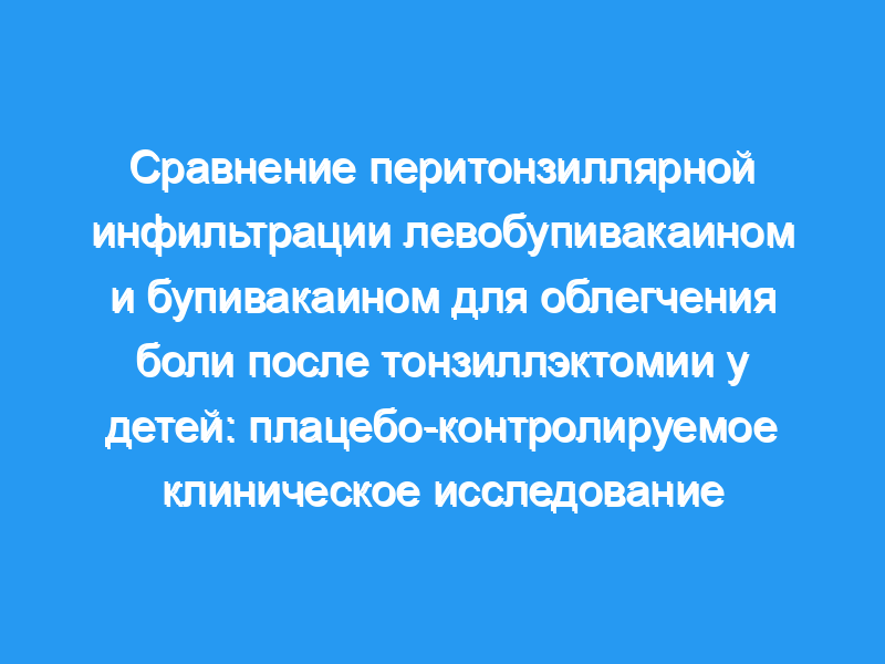 Шестьдесят детей, перенесших плановую тонзиллэктомию или аденотонзиллэктомию, были случайным образом распределены на три группы перед тонзиллэктомией: перитонзиллярные инфильтраты с 0,25% левобупивакаином с адреналином 1:200 000 (группа левобупивакаина, n=20), 0,25% бупивакаина с адреналином 1:200 000 (группа бупивакаина, n=20), и применяли обычный физиологический раствор (групповой физиологический раствор, n=20). Боль оценивали с помощью модифицированной шкалы боли Детской больницы Восточного Онтарио (mCHEOPS). Выбором дополнительного анальгетика для всех пациентов был ацетаминофен.