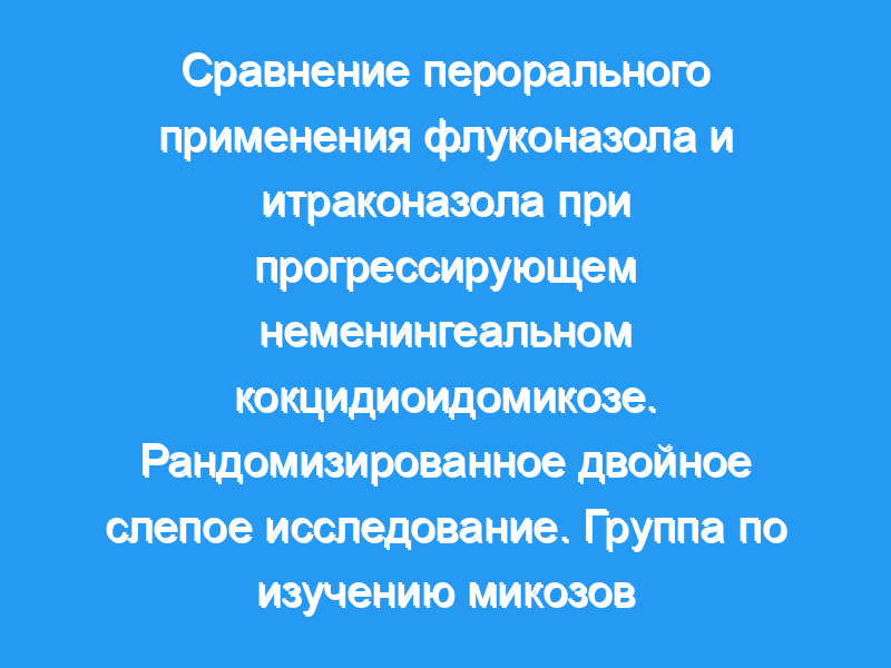 7 лечебных центров в Калифорнии, Аризоне и Техасе. Пациенты: 198 пациентов с хроническими кокцидиоидными инфекциями легких, мягких тканей или скелета. Вмешательство: Пероральный флуконазол, 400 мг/сут, или итраконазол, 200 мг два раза в день.