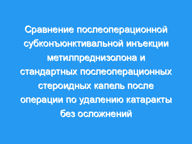 В это проспективное рандомизированное контролируемое исследование были включены две группы по 25 пациентов в каждой. Пациентам в инъекционной группе была сделана субконъюнктивальная инъекция 20 мг метилпреднизолона, а местная группа получила традиционную послеоперационную помощь с использованием стероидных глазных капель (дексаметазон 1 мг/мл). Пациенты были обследованы через 1 неделю и 1 месяц после операции. Была проведена оценка воспаления передней камеры и ВГД с помощью щелевой лампы. Изменения ВГД ≥2,4 мм рт. ст. считались клинически значимыми.