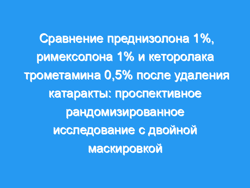 Сорок пять пациентов были включены в это проспективное рандомизированное двойное слепое исследование. Им было назначено местное лечение офтальмологическим раствором преднизолона, римексолона или кеторолака трометамина после факоэмульсификации для удаления катаракты. На 1-й, 3-й, 5-й, 14-й и 28-й дни после операции оценивали остроту зрения с наилучшей коррекцией, внутриглазное давление (ВГД), исследование переднего сегмента с помощью щелевой лампы и отчет о комфорте пациентов и сравнивали их с помощью анализа рангового времени по Фридману.