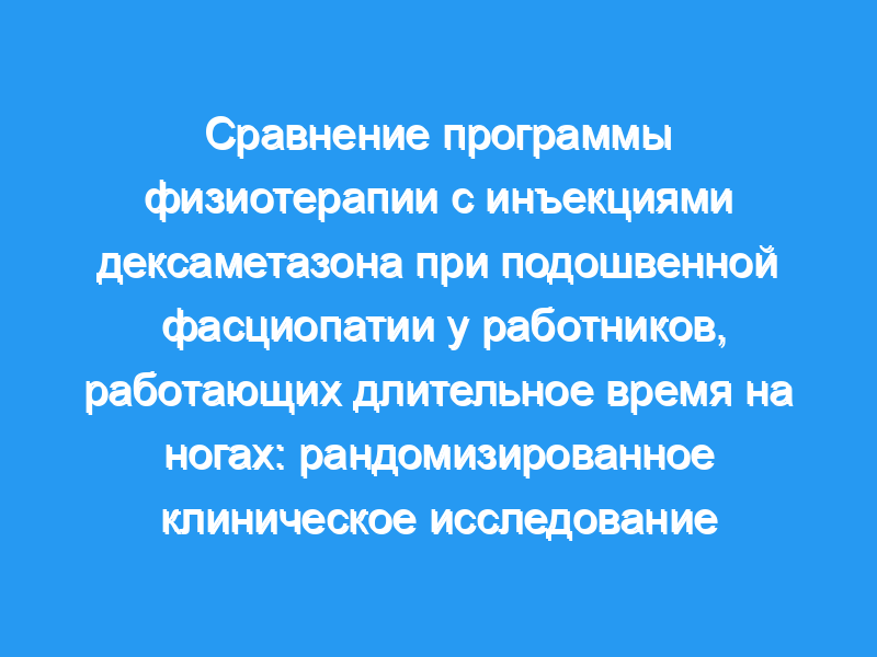 Амбулаторная клиника спортивной медицины в Ванкувере, Британская Колумбия, Канада. Участники: В исследовании приняли участие пятьдесят шесть работников, которым требовалось стоять более 5 часов в сутки с хронической подошвенной фасциопатией. Диагноз, поставленный физиотерапевтом, должен включать признаки структурных изменений подошвенной фасции, видимые на УЗИ. Вмешательства: ФИЗИОТЕРАПЕВТИЧЕСКАЯ группа включала 7 упражнений под руководством физиотерапевта, выполняемых ежедневно в течение 12-недельного периода. Группа ИНЪЕКЦИЙ получила 1 инъекцию дексаметазона под контролем пальпации, за которой последовала ежедневная процедура растяжки икр. Основные итоговые показатели: Индекс инвалидности стопы и голеностопного сустава (FADI) оценивает внешний вид связок через 12 недель после вмешательства и на основе ультразвукового исследования.