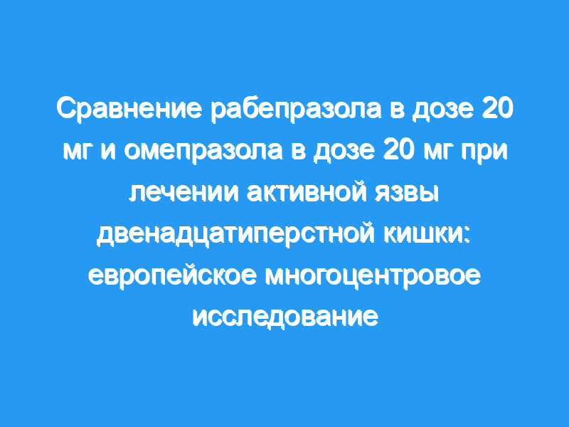 Рабепразол натрия является новейшим представителем класса замещенных молекул бензимидазола, известных как ингибиторы протонной помпы. Было показано, что другие ингибиторы протонной помпы эффективны при лечении активной язвы двенадцатиперстной кишки. Метод: В этом рандомизированном двойном слепом многоцентровом исследовании, проведенном в 25 европейских центрах, сравнивалась эффективность и переносимость рабепразола и омепразола у пациентов с активными язвами двенадцатиперстной кишки. Сто два пациента с активной язвой двенадцатиперстной кишки получали рабепразол в дозе 20 мг, а 103 пациента — омепразол в дозе 20 мг один раз в день в течение 2 или 4 недель, при этом заживление язвы контролировалось с помощью эндоскопии.