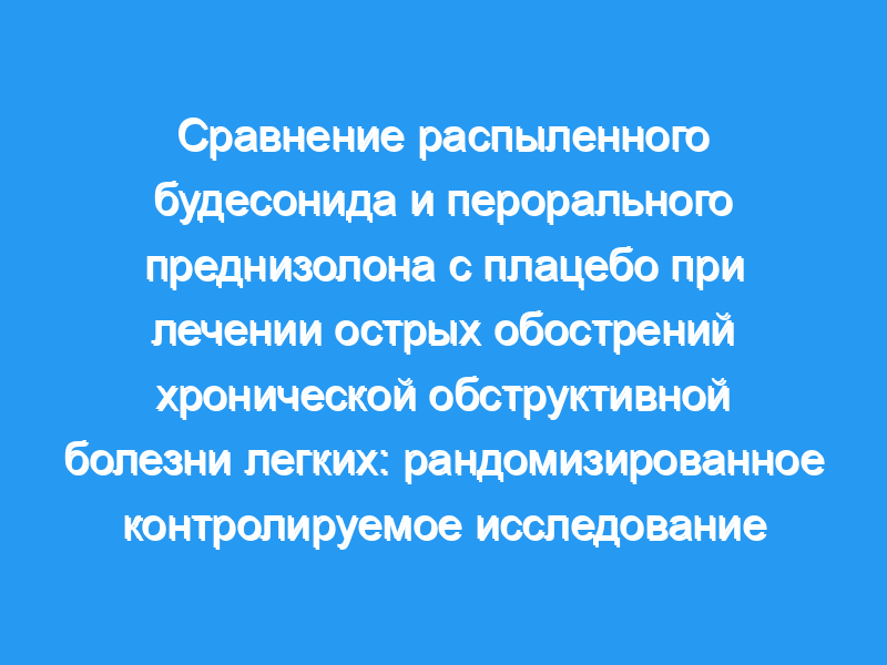 Распыленный будесонид успешно использовался для лечения острого обострения астмы, и мы предположили, что он также может быть эффективен при обострениях хронической обструктивной болезни легких (ХОБЛ). В этом многоцентровом двойном слепом рандомизированном плацебо-контролируемом исследовании сравнивалась эффективность распыленного будесонида (Пульмикорт Респулес/Небуамп), перорального преднизолона и плацебо у 199 пациентов с острыми обострениями ХОБЛ, требующими госпитализации.