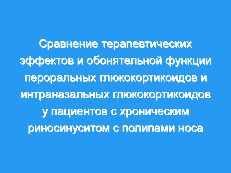 Сравнить терапевтические эффекты и обонятельную функцию пероральных глюкокортикоидов и интраназальных глюкокортикоидов у пациентов с хроническим риносинуситом (CRS) с полипами носа. Дизайн исследования: Экспериментальное исследование. Место и продолжительность обучения: Сучжоуская больница интегрированной традиционной китайской и западной медицины, с января 2018 года по ноябрь 2019 года. Методология: Сто двадцать два пациента с CRS с полипами носа были случайным образом разделены на группы A и B по 61 случаю в каждой группе. Группа А получала местное применение глюкокортикоидов (дексаметазона) после эндоскопической операции на носу. Группа В получала пероральный глюкокортикоид (преднизолон) за неделю до операции и через три недели после операции. Было проведено сравнение клинических эффектов двух групп.