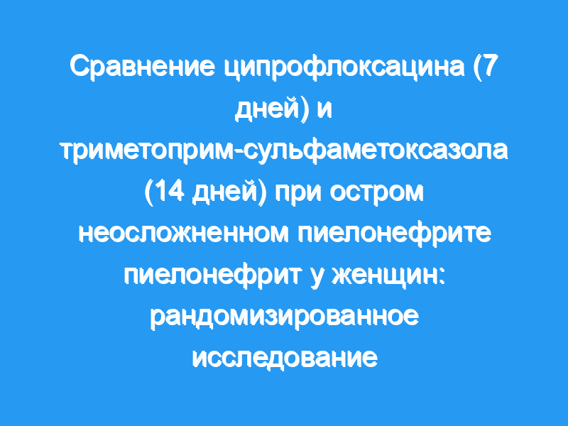 Сравнить эффективность и безопасность 7-дневного режима приема ципрофлоксацина и 14-дневного режима приема триметоприма-сульфаметоксазола для лечения острого пиелонефрита у женщин. Дизайн: Рандомизированное двойное слепое сравнительное исследование, проводившееся с октября 1994 года по январь 1997 года.