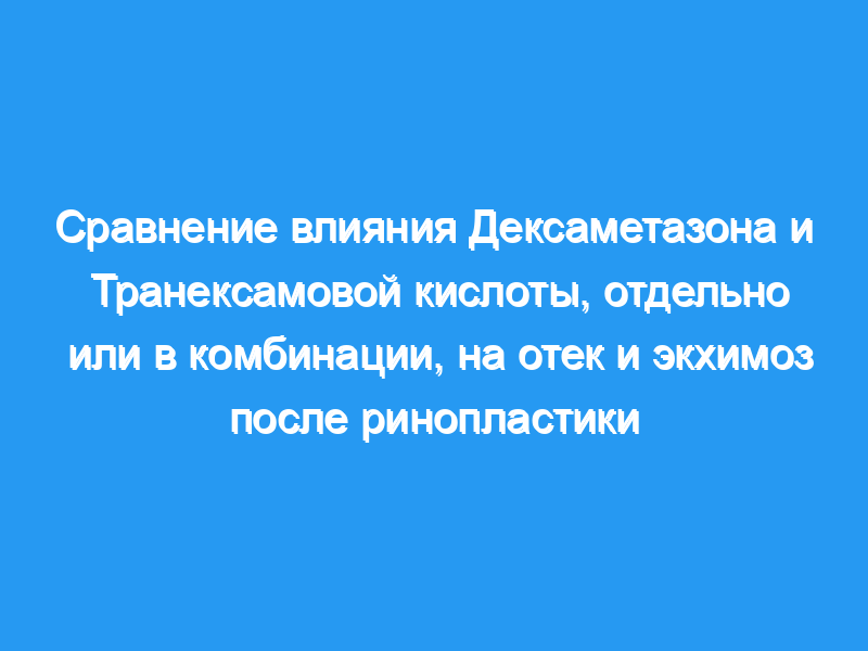 Транексамовая кислота и дексаметазон, отдельно или в комбинации, имели сходные эффекты в уменьшении периорбитального отека и экхимоза при открытой ринопластике. Комбинированное применение не показало значительно более высокого полезного эффекта в этом отношении. Уровень доказательств iii: Этот журнал требует, чтобы авторы присваивали каждой статье определенный уровень доказательств. Для получения полного описания этих рейтингов доказательной медицины, пожалуйста, обратитесь к Оглавлению или онлайн-инструкциям для авторов www.springer.com/00266 .
