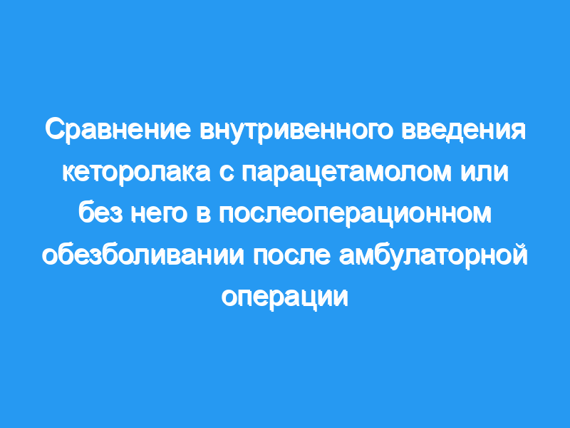 Целью этого рандомизированного слепого исследования с участием пациентов было сравнение эффективности и безопасности перорального приема парацетамола плюс внутривенного (в/в) кеторолака с внутривенным введением только кеторолака после амбулаторного опорожнения матки. План и методы исследования: Женщины были рандомизированы для приема внутрь парацетамола (1 г) в форме, тающей во рту, без воды, плюс кеторолак (30 мг внутривенно один раз в день (o.d.)) или кеторолак (30 мг внутривенно.d.) в качестве монотерапии. Средняя продолжительность опорожнения матки составила 11 минут в группе, принимавшей парацетамол + кеторолак, и 13 минут в группе, принимавшей только кеторолак. Парацетамол вводили за 15 минут до операции, при выписке из больницы (в среднем через 6 часов после операции) и утром на следующий день после операции, в то время как кеторолак вводили в конце хирургического вмешательства. Основные итоговые показатели: Числовая рейтинговая шкала (NRS) использовалась пациентами для оценки их боли по 11-балльной шкале.