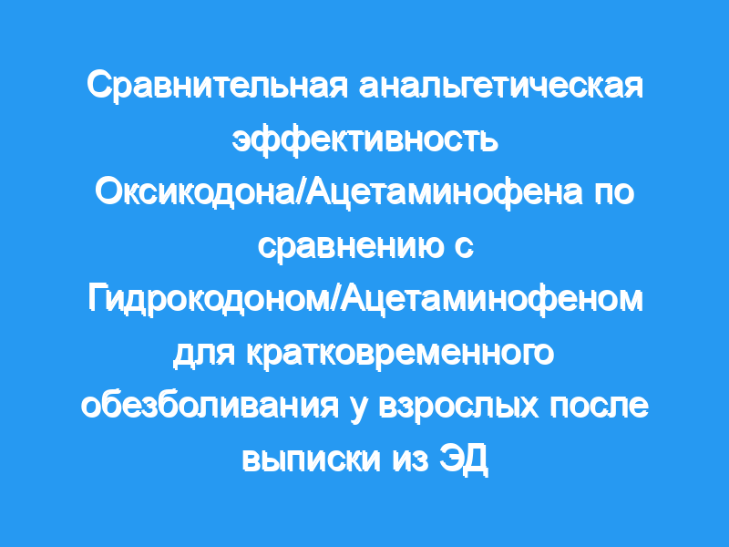 В общей сложности было зарегистрировано 240 пациентов. Окончательная выборка состояла из 220 пациентов, 107 из которых были случайным образом распределены на оксикодон/ацетаминофен и 113 — на гидрокодон/ацетаминофен. Через 24 часа после выписки из больницы средние показатели боли NRS до последней дозы амбулаторного обезболивающего составили 7,8 и 7,9 в группах оксикодон/ацетаминофен и гидрокодон/ацетаминофен соответственно. Среднее снижение показателей боли за 2 часа составило 4,4 единицы NRS в группе оксикодона/ацетаминофена по сравнению с 4,0 единицами NRS в группе гидрокодона/ацетаминофена, при разнице в 0,4 единицы NRS (95% доверительный интервал = от -0,2 до 1,1 единиц NRS). Удовлетворенность анальгетиками была такой же.