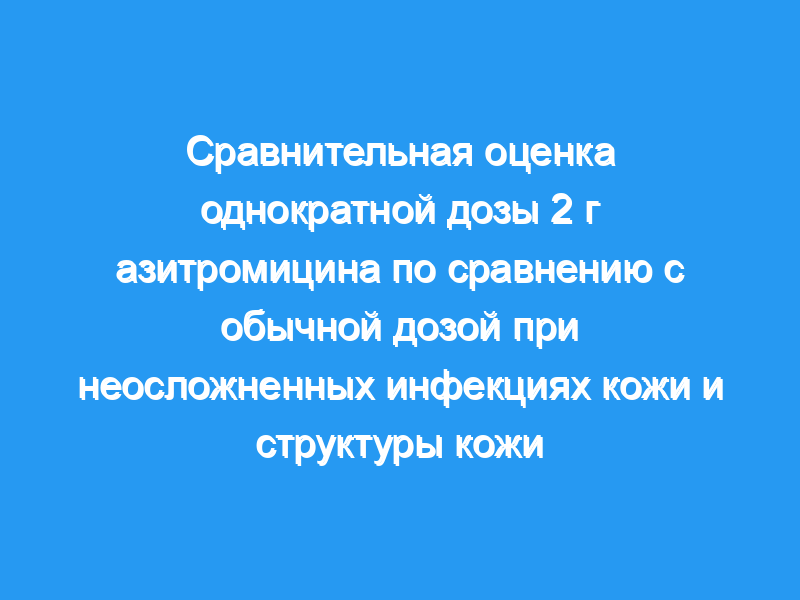 Неосложненные инфекции кожи и структуры кожи (uSSSIs) являются распространенной клинической проблемой. Большинство из них вызываются стафилококками и стрептококками. Для УССИ используются различные пероральные антибиотики с сопоставимой эффективностью, но разной продолжительностью лечения, стоимостью и профилем побочных эффектов. Азитромицин используется в uSSSI у взрослых обычно в дозе 500 мг один раз в течение 5 дней. Обширное распределение препарата в тканях и длительный период его полувыведения побудили нас исследовать, вызовет ли однократная доза препарата в 2 г реакцию при uSSSI, сравнимую с обычной дозировкой.