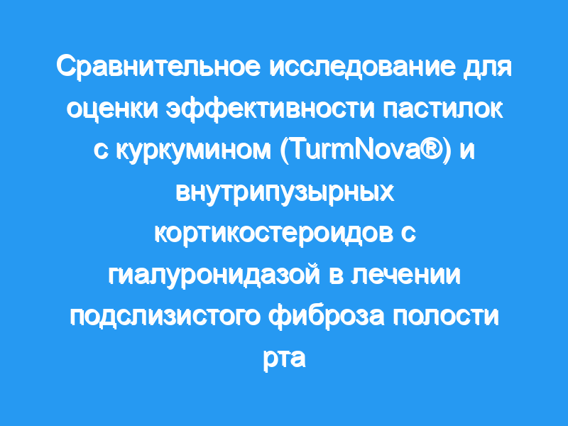 Цель и задачи: Цель данного исследования — сравнить эффективность пастилок TurmNova® и его активного ингредиента «куркумин» в качестве недорогого, безопасного и неинвазивного химиопрофилактирующего средства с внутрипузырными кортикостероидами (с гиалуронидазой) при лечении подслизистого фиброза полости рта (OSMF).
