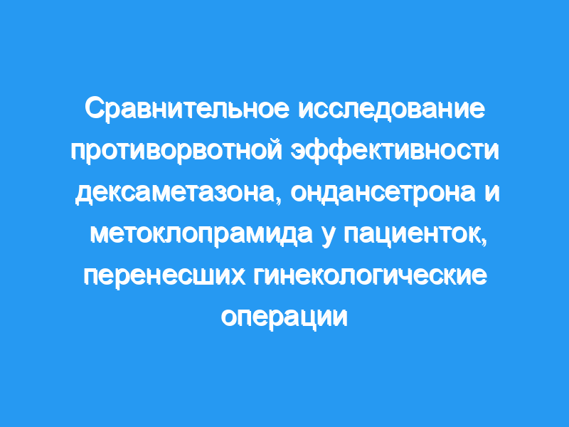 Послеоперационная тошнота и рвота (PONV) являются одними из наиболее распространенных и нежелательных побочных эффектов после операции, проведенной под общим наркозом. Мы исследовали профилактическую ценность дексаметазона в качестве альтернативы ондансетрону или метоклопрамиду для предотвращения ПОНВ после гинекологических операций. Материал/методы: В исследование были включены сто шестьдесят пациенток с ASA I-II, которым была назначена плановая гинекологическая операция. Перед введением анестезии пациенты были случайным образом распределены для внутривенного введения дексаметазона (8 мг) в группе D, ондансетрона (4 мг) в группе O, метоклопрамида (10 мг) в группе M и физиологического раствора (2 мл) в группе P. Общая частота тошноты и рвоты, потребность в спасательных противорвотных средствах, боль баллы и любые побочные эффекты регистрировались в течение 3 периодов наблюдения (0-2 часа, 2-12 часов и 12-24 часа).