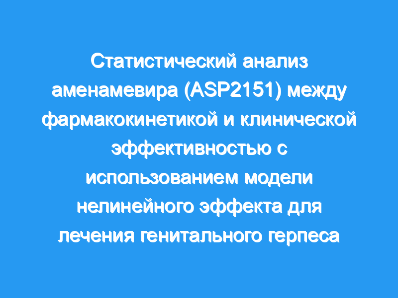 Участники самостоятельно принимали ASP2151 (100, 200 или 400 мг ежедневно в течение 3 дней), ASP2151 (1200 мг в виде разовой дозы), плацебо для 3 дня или Валацикловир (500 мг два раза в день в течение 3 дней). Мы представляем первый популяционный фармакокинетический (PPK) анализ моделирования Аменамевира для пациента с генитальным герпесом.