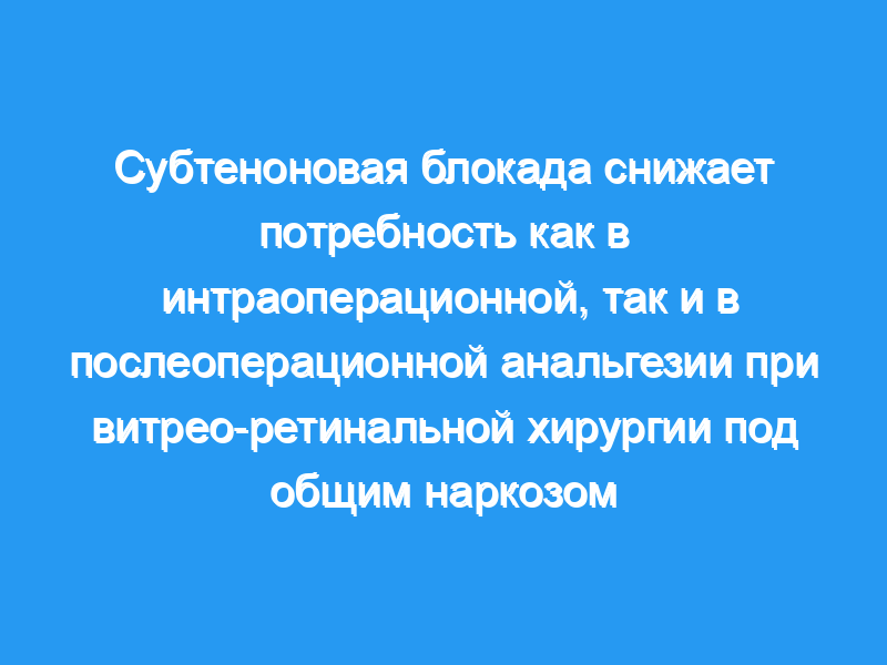 Мы сравнили влияние блокады местной анестезии Субтенона и плацебо на периоперационную потребность в опиоидах и стабильность сердечно-сосудистой системы, а также на послеоперационную боль, тошноту и рвоту у пациентов, перенесших витрео-ретинальную операцию под общим наркозом.