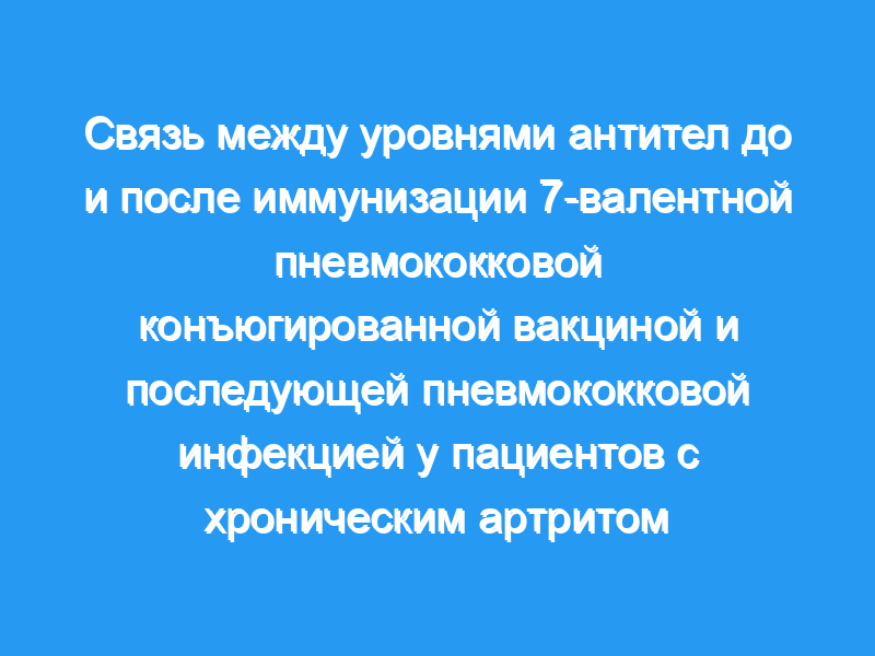 Когорта из 497 пациентов (RA=248 и SpA=249) получила однократную дозу PCV7. Во время вакцинации пациенты получали метотрексат (MTX, n=85), анти-фактор некроза опухоли (анти-TNF) + MTX (n=169), монотерапию анти-TNF (n=158) и нестероидные противовоспалительные препараты (НПВП)/анальгетики (n=85). Уровни антител серотипов 6B и 23B анализировали до и через 4-6 недель после вакцинации с использованием стандартного иммуноферментного анализа (ИФА). Серьезные пневмококковые инфекции (пневмония/инфекция нижних дыхательных путей, менингит, сепсис, септический артрит), возникшие в течение 4,5 лет после вакцинации, были выявлены в Регистре здравоохранения Сконе с использованием кодов Международной классификации болезней десятого пересмотра (МКБ-10). Связь между уровнями поствакцинальных антител и защитой от инфекций и определением уровней защитного отключения была исследована с использованием кривых рабочих характеристик приемника (ROC). Предикторы инфекции были изучены с помощью регрессионного анализа.