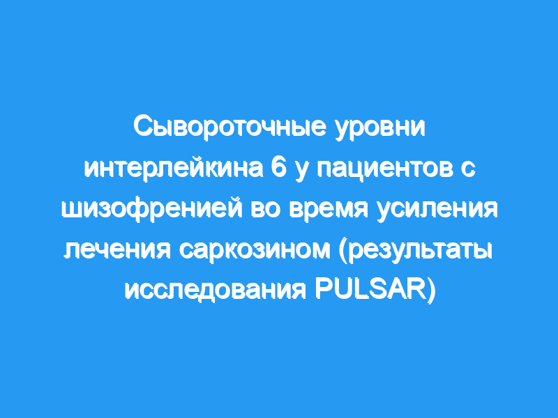 Выявление взаимосвязи между начальной концентрацией IL-6 в сыворотке крови или ее изменениями и тяжестью симптомов в результате добавления саркозина к стабильной антипсихотической терапии. Метод: Пятьдесят восемь человек с шизофренией с преимущественно негативными симптомами завершили 6-месячное рандомизированное двойное слепое плацебо-контролируемое проспективное исследование. Пациенты получали 2 г саркозина (n = 29) или плацебо (n = 30) ежедневно per os. Мы измерили уровень IL-6 и тяжесть симптомов в начале, через 6 недель и 6 месяцев. В качестве основных клинических инструментов мы использовали шкалу положительных и отрицательных синдромов (PANSS) и шкалу депрессии Калгари при шизофрении (CDSS).