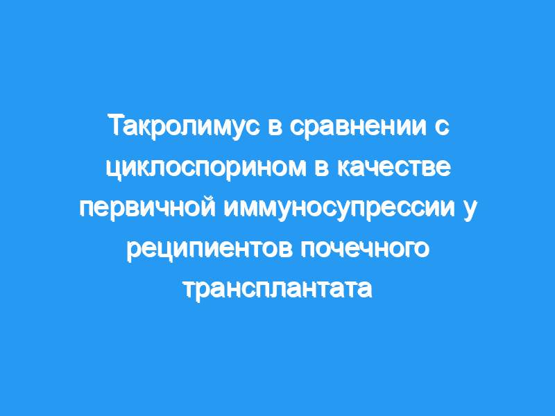 Сравнить эффекты такролимуса и циклоспорина в качестве первичной терапии для реципиентов почечного трансплантата. Стратегия поиска: был проведен поиск в MEDLINE, EMBASE, Центральном регистре контролируемых исследований Кокрейна, регистре специалистов Кокрейновской почечной группы и материалах конференций для выявления соответствующих отчетов о рандомизированных контролируемых исследованиях (РКИ). Два рецензента независимо оценивали испытания на предмет приемлемости, качества и извлеченных данных. Критерии отбора: Все РКИ, в которых такролимус сравнивали с циклоспорином для первоначального лечения реципиентов почечного трансплантата Сбор и анализ данных: Данные были обобщены (модель случайных эффектов), а результаты выражены в виде относительного риска (RR), значения <,1 в пользу такролимуса, с 95% доверительными интервалами (ДИ). Анализ подгрупп и мета-регрессия были использованы для изучения потенциальной модификации эффекта из-за различий в дизайне исследования и сопутствующих иммуносупрессивных вмешательствах.